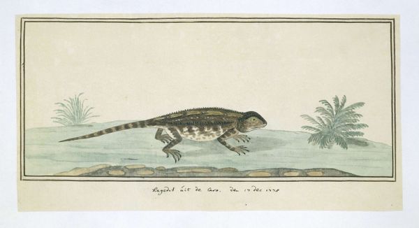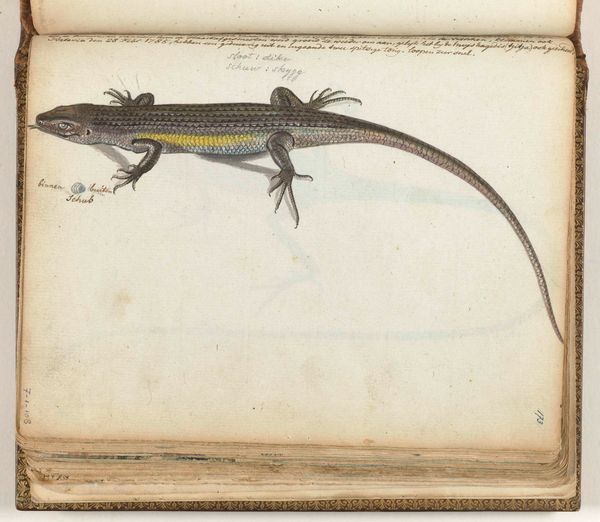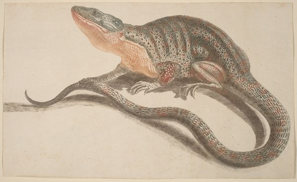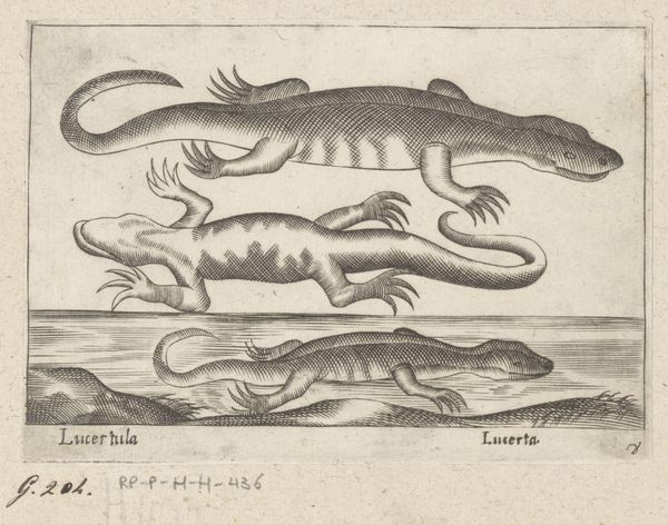 Editor: This engraving from the 1740s, entitled "En Krokodille" by Johanna Fosie, presents a crocodile in striking detail. The texture and pattern on its skin are fascinating, and its wide-open jaws make a powerful impression. What cultural understanding might be embedded in this depiction? Curator: Indeed. Note the specificity of line, the dedication to pattern, as you observed. Do you feel a sense of naturalism? Or does something strike you as…off? These early depictions of crocodiles weren't always based on direct observation. Consider what the crocodile symbolized historically - a creature of immense power, danger, and otherness, particularly to Europeans unfamiliar with its natural habitat. Editor: So it's less about scientific accuracy and more about… symbolic projection? Curator: Precisely! The crocodile becomes a screen onto which anxieties about the unknown were projected. Think about it - the very notion of 'the crocodile' conjures up biblical associations with chaos and primal forces. It can embody a 'foreign' threat, speaking to cultural fears that this image might have triggered at the time. How do you interpret its meaning for its original audience, given those associations? Editor: I see what you mean! It makes me think about how we understand our relationship with the natural world even today, filtered through these symbolic lenses inherited from the past. So much cultural baggage tied up in this one animal. Curator: Precisely. Consider how the very act of categorizing and depicting the natural world reveals our evolving understanding and, sometimes, misunderstandings. The image resonates beyond a mere record, revealing a window into history, a visual encapsulation of knowledge and emotion. Editor: Thank you, this has given me so much to think about, looking beyond the surface into layers of symbolism and historical context.