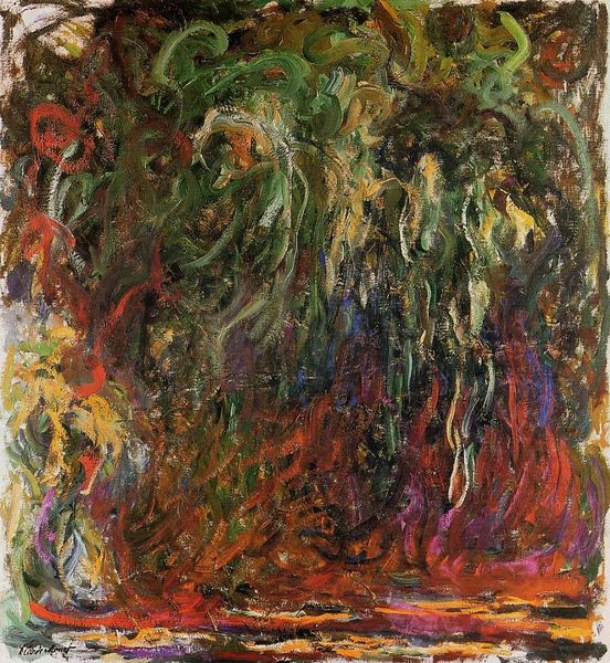 Curator: Odilon Redon's "The Death of Orpheus" presents us with a vibrant, unsettling canvas. What strikes you first? Editor: The raw emotionality. It feels like a scream rendered in paint, Orpheus's demise a potent symbol of silenced voices. Curator: Note how Redon uses color – fiery reds and yellows against a somber background. The composition emphasizes Orpheus’s passivity, doesn't it? Editor: Absolutely, and the grotesque rock formation looming over him suggests societal forces crushing individuality. Think of the marginalized artists of Redon’s time! Curator: A powerful reading. For me, the painting's ambiguous space and the unsettling color harmonies speak to a deeper, existential unease. Editor: It is a reminder that even beauty and art can be vulnerable to the violence of power. Curator: Indeed, a complex and multifaceted work. Editor: A crucial artwork, prompting us to confront uncomfortable truths about art and the world.