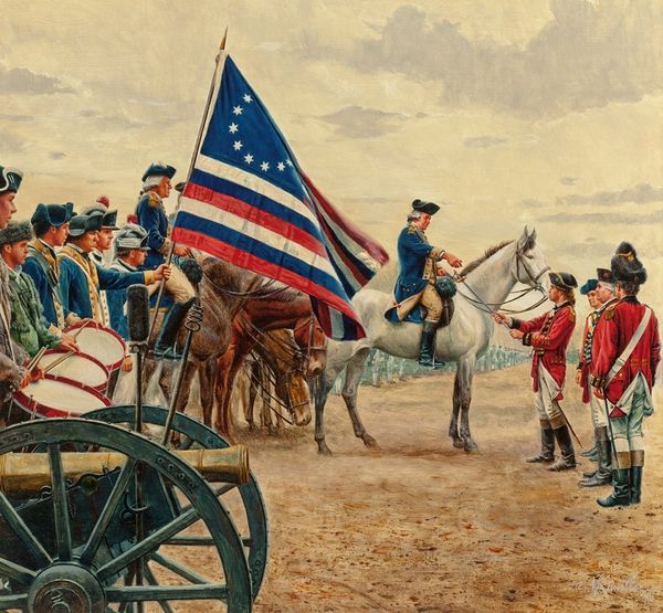 Emanuel Leutze painted this dramatic scene with oil on canvas, depicting a pivotal moment in American history. The painting’s structure is dominated by the diagonal thrust of the boat, cutting through a turbulent river rendered with thick brushstrokes. Ice floes, painted with sharp, angular forms, create a sense of precariousness. Leutze uses a theatrical composition, staging the crossing as a heroic endeavor, emphasizing the determination of Washington and his troops. The American flag serves as a visual anchor, its stars and stripes boldly contrasting with the muted tones of the winter landscape. Consider how the artist employs light, with a break in the clouds illuminating Washington. This formal device elevates the scene to almost mythical status, reinforcing the idea of divine providence guiding the nation's destiny. The painting operates as a tableau, freezing a moment of transition and projecting it as a symbol of American resilience and resolve.