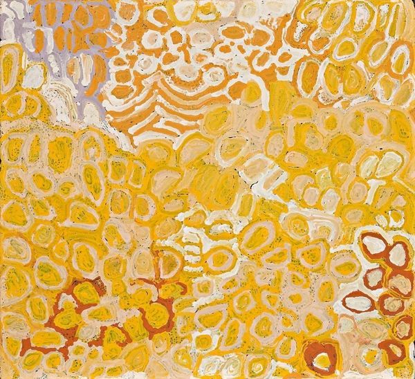 Curator: Well, I see this painting by Makinti Napanangka as a window into a complex symbolic system, an Indigenous mapping of land, stories, and cultural memory all rolled into one canvas. She titled it "Kungka Kutjarra (Two Women)," dating back to 2000, painted using acrylic. What are your immediate impressions? Editor: I find myself strangely soothed by this piece; it feels like sinking into warm sand. All those ochre and white stripes, like echoes rippling across a landscape. There's something inherently grounding about the repetition, don't you think? It's a visual mantra. Curator: Absolutely, and this repetition speaks volumes. Pattern isn’t merely decorative here, it is deeply communicative. Indigenous art is so rich in its encoded narratives, you can imagine it representing generations of ancestral connection through the very same colors and patterns. Each dot, each line likely signifies places, resources, and women. Editor: "Two Women..." I keep returning to that title. Considering that the image features a semi-abstracted composition with geometric and organic patterns, do you think the symbolism is centered more around the shared stories or a geographical landmark? I imagine it is both. Curator: More likely it’s an "everywhen", if that makes sense: past, present, and future entwined. These two women exist in Dreamtime, enacting rituals that affect the tangible world. We might interpret those circles and curves up top as representations of gathered bush tucker, or possibly as sites of significant women’s ceremonies. The painting feels not only spatial but temporal, as well. Editor: That resonates—a cyclical kind of narrative where landscape and identity become interwoven. Perhaps Napanangka taps into Jungian concepts of the collective unconscious in her artwork? Curator: Quite possibly! There’s a primal element that really cuts through. We recognize an effort to symbolize basic human interactions. Those warm hues, reminiscent of earth and fire, could represent origins—the shared birthplace. These recurring symbols almost feel like a portal—a way to visually access our innate, communal experiences. Editor: Well, it's hard not to be moved. I came looking at patterns in the piece and end up seeing connections to our universal narrative, beautifully retold in ochre on linen!