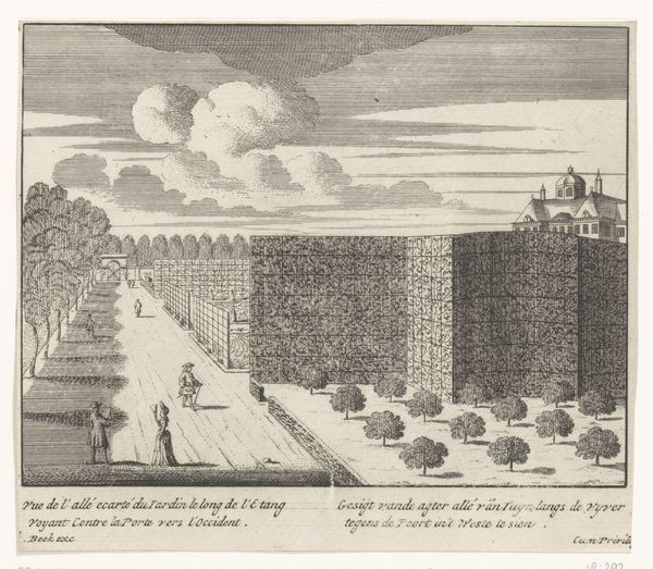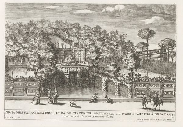 Curator: Let's consider this engraving, "Fontein in de Villa Borghese te Rome," created between 1653 and 1691 by Giovanni Francesco Venturini. What's your immediate reaction? Editor: The symmetry is almost oppressive. A ring of verdant, almost claustrophobic trees. Statues like watchful sentinels… It evokes a feeling of controlled nature, very artificial. Curator: And indeed! Look at how the material itself communicates status. Marble is employed not just for the fountain’s basins but echoed in balustrades and sculpture plinths, declaring wealth. Observe, too, how the printing process—engraving—mirrors that careful ordering: incised lines forming the rigid patterns. This was labor, meticulously planned, painstakingly executed to visualize power and wealth. Editor: That water motif, ever-flowing water presented as controlled excess, a clear emblem of power. Think of fountains through history, not just as ornament, but as declarations: access, plenty, prosperity carefully staged in the landscape as theater. And notice those figures – how small they are placed next to this scene. It’s to reinforce a symbolic narrative. Curator: Good eye! And in its original context as a print, consider how that multiplied the statement. Ownership wasn't limited to physically experiencing the Borghese gardens, but it permeated society via reproduced images available to various consumers. A controlled method of showing, influencing perceptions, and normalizing social strata through widespread visual consumption. Editor: Precisely! That fountain almost becomes a kind of repeated ideogram for Roman opulence. Even the cloud formation above becomes artfully integrated, it emphasizes an aspirational scene imbued with dynastic overtones. Curator: The labor required to create that image—and the layers of cultural messaging it conveys about production, access, and status...it all informs my appreciation of the work. Editor: For me, seeing that delicate etching, I'm struck by how lasting symbols affect emotions – power, beauty, control. It persists beyond Venturini's time and remains potent to this day.