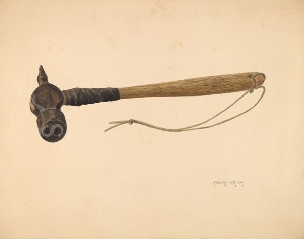 Curator: Looking at this drawing by Ralph Morton, created sometime between 1935 and 1942, titled *Trivet*, I'm immediately struck by its intimacy. It's not a grand statement, but a quiet observation of the everyday. Editor: Absolutely. I sense an artisan's care in rendering this commonplace object, elevating it. It makes me think of how so much of our material culture, particularly during that time, was imbued with a handcrafted feel— a rebellion against the looming machine age? Curator: Exactly! The choice of medium, watercolor, mixed-media, pencil, even charcoal hints at that intimate approach. There's a tenderness in capturing the object's form, the texture of the wood perhaps, the small floral decoration... Editor: It's as if Morton is reminding us that even the simplest objects hold value. We must remember that this wasn't created in isolation: the decorative arts movement pushed against mass production by re-instating historical techniques into their works. How did the economic turbulence affect the perception and consumption of art and functional goods during that period? Curator: Undoubtedly, Morton found some way to blend usefulness and artistry. The pencil work lends itself beautifully to the rendering of ornate flourishes while keeping this a practical domestic scene. Editor: And isn’t it interesting to consider how museums have traditionally treated decorative arts? Often relegated to the background, they're only now beginning to be seen as holding narratives equal to painting and sculpture. The subtle politics of display! Curator: Well, you see them both differently now: A testament to craft, a moment of beauty found in utility, a study in a difficult era... Ralph Morton is saying something gentle and strong. Editor: I completely agree; looking closer now, I can sense this deeper context around it, that this drawing of an ordinary object is quite extraordinary, and perhaps a glimpse into a resilient domestic life in troubled times.