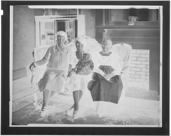 Curator: The visual texture of this photograph, "Untitled (two women standing for portrait in studio)" by John Deusing, really captures the viewer's attention. The stark contrast evokes a sense of mystery. Editor: It reminds me of a vintage postcard, perhaps taken in the early 20th century. Curator: Indeed, the fashions suggest a period aesthetic. The image size is just 12.7 x 10.16 cm, which is quite small, intimate, and private. This suggests the photograph may have been produced as a family momento. Editor: The soft focus and negative reversal also add to that feeling, almost blurring the edges of their identities. Curator: It’s easy to feel a sense of nostalgia when considering the social context of portraiture from this time. Editor: Absolutely, and the framing itself, almost like looking through a window, adds another layer of distance and intimacy.