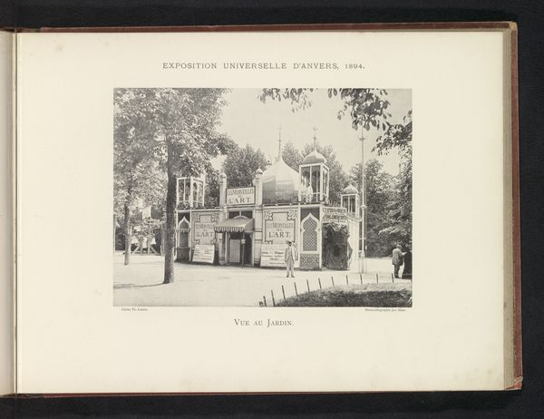 Curator: This image captures the World Exhibition in Antwerp, 1894. The name attributed to this print is Th. Lantin, a view of the Garden in a captivating black and white photograph. Editor: Oh, this is neat! I immediately get this nostalgic feeling, like peering into a sepia-toned dream. The way the light dapples, almost blurring the figures into suggestions. Curator: Yes, I agree that it evokes that sentiment; this artwork showcases japonisme through a city scene, where its influence could stem from capturing fleeting moments and asymmetry, something adopted during that period. Notice how buildings fill the shot alongside many small figures, all softened by the photography methods from that time? Editor: Indeed. I’m drawn to how the different buildings lead the eye toward this pavilion structure, maybe. Is it supposed to give a feeling of depth within such a simple print? It seems they focused on the contrast more than the definition of specific forms here. Curator: Exactly, they capture and translate architectural grandeur by merging Japanese asymmetry and impressionistic themes, emphasizing emotional effect by not being precise. The structures almost fade within its tones, even. The buildings represent more than bricks and mortar; the composition suggests the aspiration and innovation embodied by the event, don't you think? Editor: Perhaps there's something poignant in viewing the grand architecture. The world fair evokes excitement for technological innovation and economic interconnectedness, all encapsulated within the artistry, while simultaneously presenting questions concerning history and what all this represented back then. Curator: Ultimately, Th. Lantin leaves us with an eloquent snapshot where the buildings speak softly; it encapsulates our reflections. Editor: A frozen whisper of the past brought into sharper focus with this photograph. It’s remarkable how much the method informs this entire interpretation.