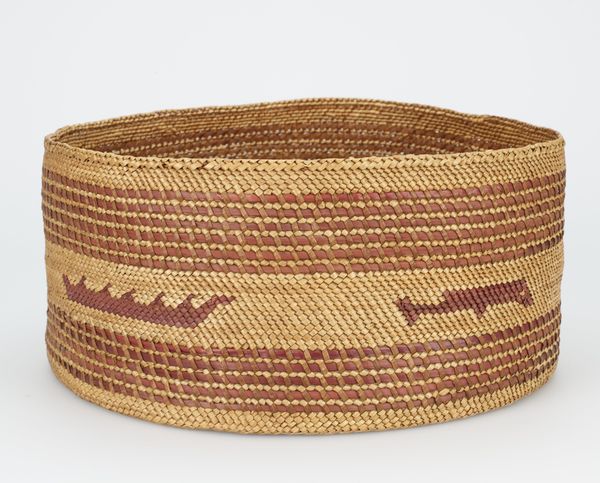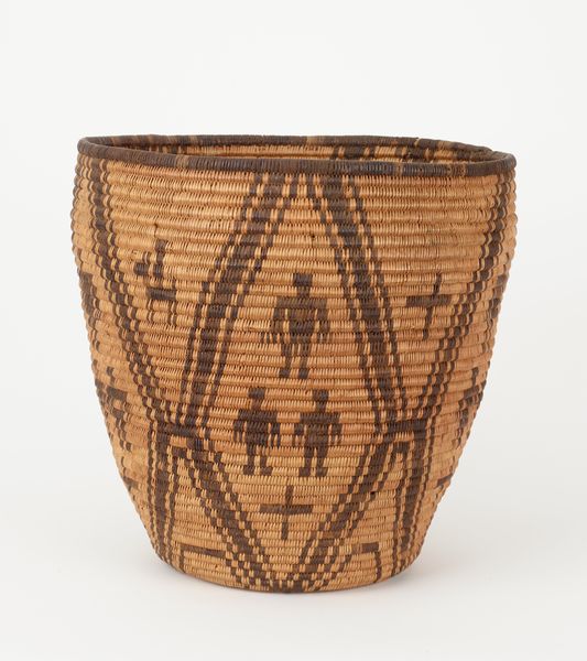 Curator: Well, let's discuss this "Basket" here. It's attributed to the Indigenous Americas and its specific date is unknown. The Minneapolis Institute of Art holds this remarkable example of weaving using fibre-art. Editor: My initial impression is one of earthiness and constraint. The geometric patterns, though simple, feel very intentional, almost rigid, which to me, creates a strong feeling of cultural tradition and, frankly, the burden of expectations tied to that. Curator: I see what you mean. Historically, we often encounter baskets used for storing and carrying food, water and even infants—but in the Indigenous Americas context, weaving possesses significance that extends beyond pure functionality. Considering the geometric shapes present in its design, might these be depictions of cosmological patterns or ancestral symbols with significant narrative depth, crucial for understanding societal roles? Editor: Absolutely! I wonder about the maker’s identity. If this basket wasn't merely for utilitarian use, but served ceremonial purposes within its community, that positions its maker—likely a woman—as not just a crafter but a critical player in the continuation of Indigenous customs and the dissemination of ancestral wisdom. Curator: Indeed. One also wonders about the availability of resources. Were the chosen natural fibers abundant or relatively scarce? How did their accessibility or scarcity play a part in either democratic accessibility, or potential exclusivity of knowledge to certain social positions or the display of particular inherited economic status? Editor: Right, the colours, though muted, suggest an engagement with environment in their extraction and, furthermore, a degree of visual sophistication we often underestimate when analyzing material culture made by marginalised groups. The basket's tight weave might have functioned beyond its physical strength: possibly encoding a deeper communal cohesiveness born from the collective knowledge of this weaving process? Curator: These intricate woven stories embedded in practical items remind us that so-called functional items carry within their threads a complex matrix of lived experience and social commentary which continues challenging perceptions concerning art’s purpose and access, and this basket provides material testament to a vibrant part of that larger narrative. Editor: Definitely, it's a compelling piece that transcends the idea of just being decorative—a tangible, complex record that really deserves greater recognition and awareness concerning Indigenous cultural heritage!