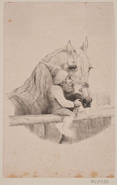 Curator: William Henry Hunt's "A Horse in a Stable," currently held at the Tate, presents a humble yet captivating scene. Editor: It's lovely, isn’t it? A bit melancholic, though. The subdued colors and the horse's posture suggest a kind of quiet resignation. Curator: Indeed. Hunt's skillful use of light and shadow draws attention to the horse's muscular form, achieved through delicate, precise chalk strokes. Look at how the light from the window highlights its back. Editor: The composition is quite simple, isn't it? The lines of the stable sort of emphasize the horse’s stillness. There’s a certain... authenticity about it. I almost feel like I can smell the hay. Curator: I agree. Hunt captures a sense of groundedness, emphasizing the beauty and dignity of a working animal in a straightforward manner. Editor: It’s a very quiet piece, really. Makes you think about the unspoken connection between humans and animals, doesn’t it? I find it very moving.
