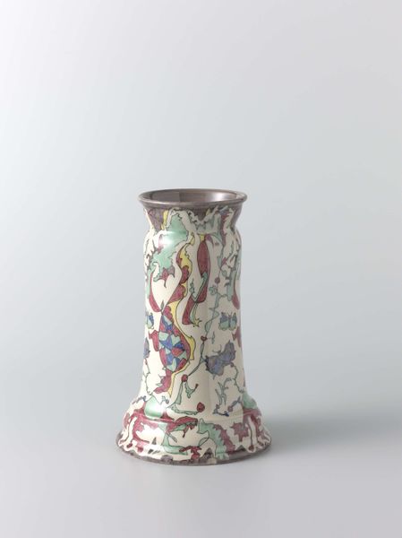 Editor: So, we're looking at a ceramic piece from 1923, "Two beakers with the ‘Hol’ (Hollow) pattern" by N.V. Plateelbakkerij Ram. The abstract geometric design really jumps out at me. What does this piece say to you? Curator: I see a reflection of the shifting societal values after World War I. Decorative arts like this became increasingly popular, democratizing artistic expression beyond the elite circles of fine art. What do you notice about the colour palette? Editor: It’s interesting – the yellow and black are quite bold against the off-white base. It’s eye-catching. Curator: Precisely. And that boldness, that embracing of geometric forms, speaks to the Art Deco movement. These designs weren't just aesthetically pleasing; they signaled a break from tradition, echoing broader socio-political changes. What was art's role in society at the time? Editor: Almost like a visual manifesto, right? Like these ceramics are contributing to this new, modern world. Curator: Exactly. Consider the accessibility of these pieces versus unique sculptures displayed only in art galleries. Art Deco brought art into everyday life. Editor: So it's not just about pretty designs, but about the social and cultural context in which those designs become popular and meaningful. I hadn't thought about it like that! Curator: Absolutely! Looking at art as part of history makes it come alive. It reflects, reinforces, or resists cultural norms. This "Hol" pattern becomes a tiny lens into that transformation. Editor: I'll never look at Art Deco the same way again. Thanks!