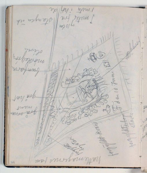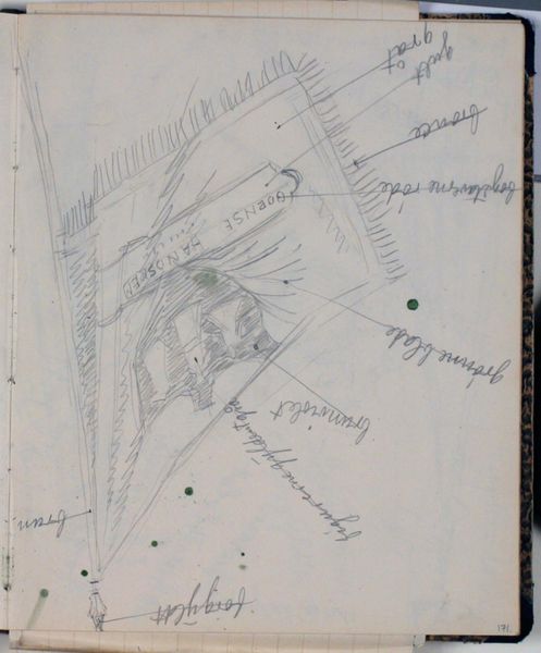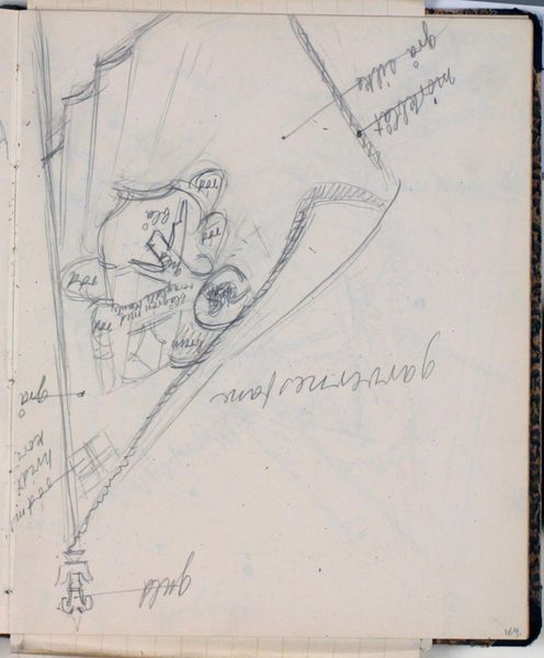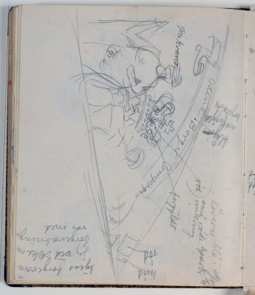 Curator: It's interesting, isn't it? This is a pencil drawing on paper by Niels Larsen Stevns, titled "Studie af rebslagerlaugets fane. Farveangivelser"—roughly translated, "Study of the Rope Makers' Guild Flag. Color indications." It's estimated to have been made sometime between 1930 and 1936. Editor: Immediately, I see a delicate and almost ephemeral sketch, its rawness speaking to an exploratory quality, but there are elements of constraint. Curator: Indeed. I'm drawn to the marks, the evidence of process. You can see how the artist is working out the composition, the layering of the lines. It offers insight into the banner's construction—its materials and dimensions. Rope makers clearly required a potent symbol for their production. Editor: Absolutely. I also see notes around the geometric composition: descriptions such as "blood red" and "gilded hand-crank," implying symbolism inherent in both color and action, which relates directly to the laborers and this particular craft, this guild. What could that blood represent within the cultural history of this Danish trade? What hierarchies are visually signaled by "the king" and "queen"? Curator: The inscriptions add another layer. Stevns is clearly concerned with the precise visual language—a symbolic shorthand of sorts. The materials here, humble as they are, belie the social weight that banners and flags often carried—a declaration of power through visual representation. These tools and hues solidify identity. Editor: Yes, the very choice of medium and format also seems to speak to the preliminary nature of the project— perhaps more like an evolving experiment, both a deeply historical study and political consideration on cultural memory-making in relation to art. Are flags just simple cloth objects? Curator: Perhaps this sketch reminds us that no object is truly simple when we start digging into its construction, materials, and purpose within a specific societal context. Editor: Right, there's an important exchange occurring here between labor, gender, history and representation – it underscores the layers that both the medium and object have when explored. Curator: So, it goes far beyond simple geometry and raw materials—it is actually quite rich, isn't it? Editor: Yes, indeed. Thank you for offering that lens.