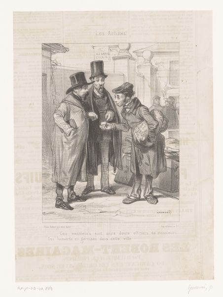 This is Frédéric Bouchot’s ‘Caricature of an admirer who arrives too early for his appointment’, made in the 19th century using lithography, a printmaking technique. Lithography relies on the immiscibility of grease and water. The design is drawn on a flat stone or metal plate with a greasy crayon, then treated with chemicals so that only the drawn areas attract ink. The resulting print captures subtle tonal variations and textures, seen here in the intricate lines defining the figures’ clothing, and their expressions. Notice how Bouchot employs this technique to critique social norms. The crisp lines and stark contrasts highlight the awkward encounter, emphasizing the discomfort of the situation. The precision of the lithographic process allows for detailed rendering of clothing and facial expressions, revealing the social status and emotional states of the figures. Ultimately, Bouchot uses lithography not just as a means of reproduction, but as a tool for social commentary, blurring the lines between artistic expression and social critique.