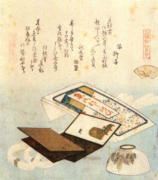 Editor: This is Katsushika Hokusai's "Hand Mirror and Hair Ornaments/The Color Shell (Irogai)," part of the "Shell-Matching Game with Genroku Poets" series. It's a print, so it’s on paper. The composition feels very still, almost meditative. What catches your eye about it? Curator: The objects themselves are potent symbols. Consider the mirror – a reflection of self, vanity, but also truth. And the hair ornaments suggest beauty, status, and ritual. How might these objects be linked to the cultural memory of the Genroku era? Editor: That’s interesting. So, are you saying the objects are less about literal representation and more about what they signify culturally? Curator: Precisely. They speak to the values, rituals, and aesthetics that defined that time. The shell game itself speaks to the ephemerality of beauty and poetic association. Editor: I never considered the deeper meanings embedded in everyday objects. It's like Hokusai is giving us clues to unlock a whole cultural narrative.