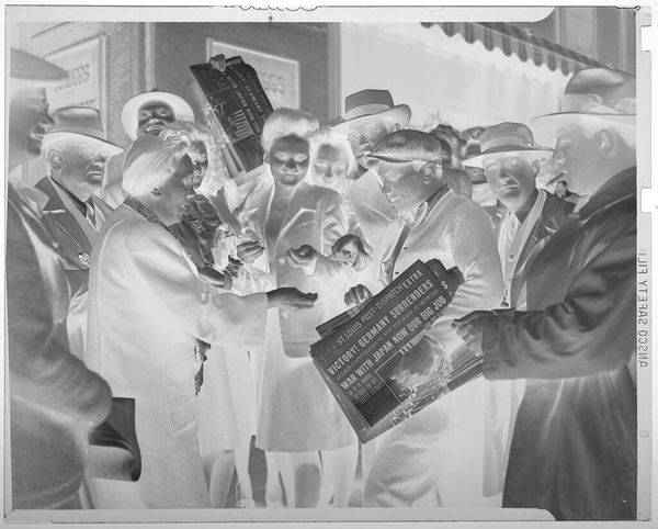 Editor: This photograph, "Untitled (buying war stamps and bonds)" by John Deusing, shows a group of people gathered around a table. It has a very formal, almost staged feel. What kind of message do you think this image conveys? Curator: It's interesting to consider this image through the lens of performative patriotism. How does the act of buying war bonds become a public spectacle, reinforcing national identity and, perhaps, suppressing dissent? Editor: So it's not just about supporting the war, but also about showing you're supporting the war. Curator: Exactly. And who is included in this performance? Whose voices and experiences might be missing or marginalized in this idealized image of wartime unity? Editor: I never thought about it that way. I'll definitely be looking at images with a more critical eye from now on! Curator: Examining those absences is key to understanding power dynamics.