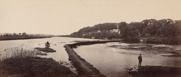 Curator: I'm drawn in by the photograph's stillness, considering its heavy historical subject matter. There's a subdued calm to the water that contradicts what I imagine must have been the anxieties of war at this location. Editor: This image, entitled "Pontoon Bridge, Across the Potomac, at Berlin, Maryland, November 1862", was captured by Alexander Gardner. An albumen print, it depicts a temporary bridge constructed during the Civil War. The bridge served a critical function. These landscapes weren't simply backgrounds; they were active sites of conflict. Curator: Bridges often symbolize transition, the movement from one state to another. A pontoon bridge, specifically, is so transient; its purpose exists only for the moment. In that moment, though, it carries not just soldiers but also the heavy weight of purpose, determination, and the unknown. Editor: The Potomac River served as a significant geographical and political boundary during the war. This bridge facilitated the movement of Union troops into Confederate territory. Consider how race and freedom intersect with these battlegrounds: African Americans, enslaved and free, were deeply affected by the outcomes of these crossings, both materially and symbolically. This isn't just a photograph of a bridge, but a threshold of immense historical consequence. Curator: And look at the lone figure standing on the edge, near the bridge's entrance. What burdens and hopes does that solitary soul carry with them? In images from this era, aren't we always implicitly searching for the human element and trying to understand what their experiences might reveal about their lives? Editor: Absolutely. It’s imperative to contextualize these images, resisting a detached reading. This is a bridge to a future fought for with extraordinary human cost, one that demanded radical social transformation. The implications of those decisions echo powerfully in contemporary discussions about equality and justice. Curator: Indeed, the bridge remains a testament to that era's upheaval and aspirations, forever marking our historical terrain. Editor: A photograph offering an entry into deeper considerations of that past, a testament to both immense progress and continued struggles for liberation.