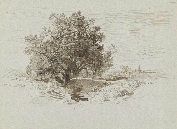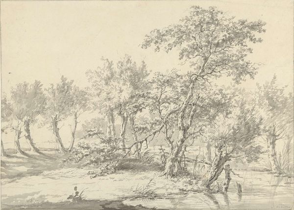Editor: This is a print titled "Traveler with Wood on a Footbridge" by François Louis Thomas Francia. The monochromatic landscape feels quite serene. What compositional elements stand out to you? Curator: Observe how the artist utilizes line to define form and create depth. The density of the hatched lines in the foreground creates a sense of tactile presence, which gradually diminishes as we move towards the background. Editor: The use of line does create a lot of texture. Is there something symbolic about the lone figure crossing the bridge? Curator: Symbolism is secondary here. Note how the figure, despite its small scale, serves as a crucial element balancing the composition. Its placement and posture guide the eye through the landscape. Editor: I see. It's more about the formal relationships than any narrative. Thanks for the insight. Curator: Indeed. Francia’s landscape invites contemplation on the interplay of form and space.
