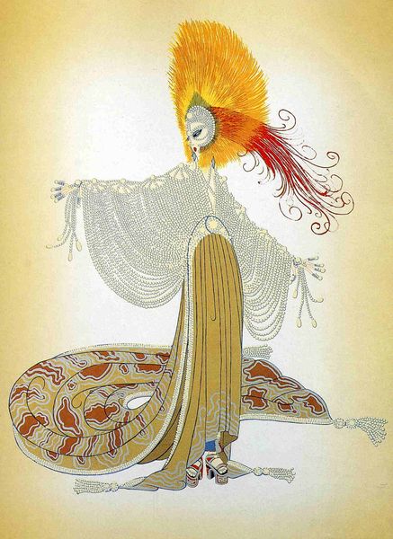 Léon Bakst designed this costume for the ballet "Cleopatra," using pencil and watercolor to capture a sense of fluid movement. You can almost feel the dancer twirling. Look at the way Bakst renders the fabrics; the orange skirt with its spotted pattern flows like water, while the red shawl seems to billow and swirl. The effect is achieved through the delicate use of watercolor washes, allowing the pigment to pool and blend organically on the paper. The pencil work underneath provides definition and structure, like the bones beneath skin. Consider how the artist captures the dancer’s pose, arms outstretched, one foot lifted. The costume design is dynamic, suggesting a body in motion, even on a static surface. It's like a snapshot of a dance, full of energy and life. The movement is all, perhaps a little like Rodin's drawings, though more sensual and less academic. This is not just a costume; it's a feeling!