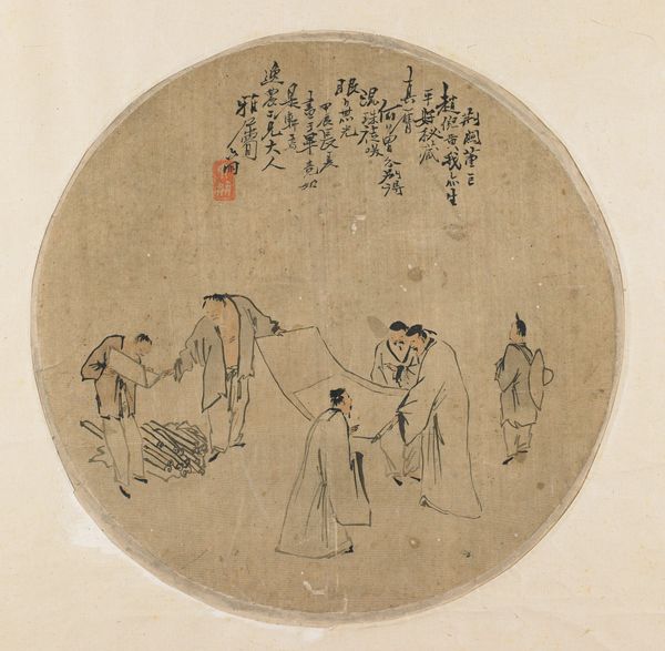 Curator: Here we have "Nomads Hunting with Falcons," an ink painting on silk attributed to Chen Juzhong, created between 1200 and 1233. It resides here at the Metropolitan Museum of Art. Editor: My first impression is of immense space. The composition, combined with the muted palette, creates a feeling of almost unbearable loneliness and starkness. Curator: It’s fascinating how the painting offers a window into the social customs of the time. Falconry was a popular aristocratic pastime and signifier of status, so its prominence in the painting speaks volumes about class and societal values. Editor: Indeed. And looking at the material application—the almost monochromatic ink wash layered so delicately onto the silk—I’m struck by the artist’s understanding of process. Consider the controlled variation in the ink, suggesting form and texture without excessive detail. Curator: Absolutely. The figures, while small, are rendered with an attention that speaks to their importance as subjects, possibly conveying ideas around masculinity and conquest within their society. Notice the way the artist uses spatial depth to establish the scale of the landscape. Editor: Yes, and consider the laborious act of preparing the silk, grinding the inks, and meticulously applying the washes. Each step necessitates specialized skills and affects the final presentation. We often overlook the inherent labor in pieces such as this. Curator: True, understanding the labour helps us place the work in a broader social context. And if we reflect on its historical context, we may recognize a dialogue about man's relationship with nature during the era the piece was created. Editor: Precisely. Reflecting on its themes of both individual experience and labour illuminates dimensions beyond the mere recording of historical traditions or aristocratic lifestyles. Curator: A confluence of factors, expertly rendered through ink on silk to preserve moments in our cultural history. Editor: Leaving us with an appreciation for both skill and artistry behind "Nomads Hunting with Falcons."