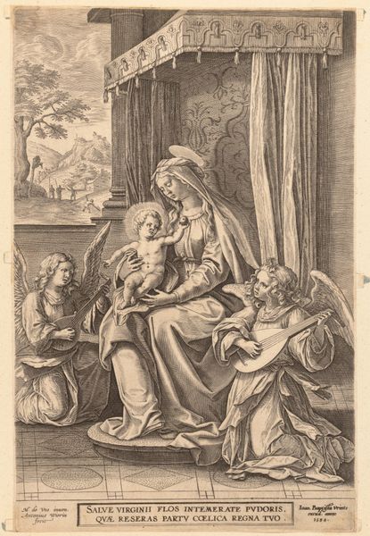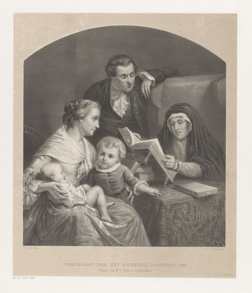 Curator: This is “Familie aan de bijbelstudie,” or "Family Studying the Bible," an engraving by Auguste Adrien Jouanin, created around 1855. What strikes you upon first viewing? Editor: Immediately, I am struck by its monochrome stillness. The composition, bathed in gentle light, focuses primarily on the tonal gradations achieved through the printmaking technique, emphasizing form and texture. The family members' faces and clothes seem to melt together due to lack of distinct tones, which affects its emotional appeal. Curator: The artwork presents a fascinating glimpse into 19th-century family life and religious practices. Its depiction speaks to the cultural emphasis on religious devotion within the domestic sphere. The very act of a family gathered around the Bible served as a signifier of moral uprightness and social respectability. Think of the construction of gender roles at this moment! Editor: From a formal standpoint, Jouanin’s masterful use of line and hatching creates a remarkable illusion of depth and volume. Observe the texture of the fabric and skin in each character—I find this most evident in the children! I am interested to examine this use of line, contrast, and how light shapes each individual form, but also in relation to the others in the family. Curator: Indeed. The generational composition speaks volumes—an elder matriarch, the parents, and children. There's a transmission of values occurring before our very eyes, underlining a patriarchal system where religious knowledge and practice are implicitly controlled. It asks: who has access to and interprets religious doctrine, and what power does this confer? Editor: Jouanin positions the family within a closed, arch-shaped boundary. Considering this with respect to form, I want to focus on that geometric element and its significance. Is this just an compositional method, or are we given an insight into the emotional dimensions and atmosphere between the sitters themselves? Curator: And that enclosed form reinforces ideas of family insularity during this era, an ideology deeply rooted in class and religious identity. Editor: What an image! Focusing on the elements of form and their use really enhanced my experience and understanding. Curator: By combining insights on how form relates to these sociohistorical forces at work, perhaps we’ve expanded our understanding of 19th-century French society.