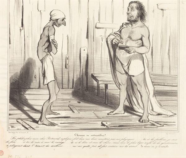 This lithograph by Honoré Daumier presents us with a scene where the human form is placed under satirical scrutiny. A man sits, his body seemingly deflated, observing two others—one emaciated, the other corpulent—in a composition that evokes both amusement and unease. Consider the ages-old motif of contrasting body types, a visual language stretching back to classical allegories of vice and virtue. Here, Daumier subverts these ideals; he strips his figures of any heroic pretense, presenting them instead as objects of social commentary. It is akin to the medieval memento mori, reminding us of our earthly transience. The artist suggests a deeper cultural anxiety. The title, roughly translating to "I'd like to know who the joker is who first said that man was the king of creation," indicates a critical eye, a questioning of humanity's self-proclaimed dominion. This is not mere caricature; it's a reflection on the human condition.