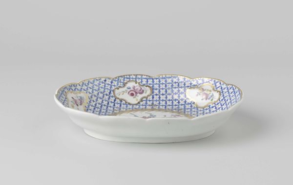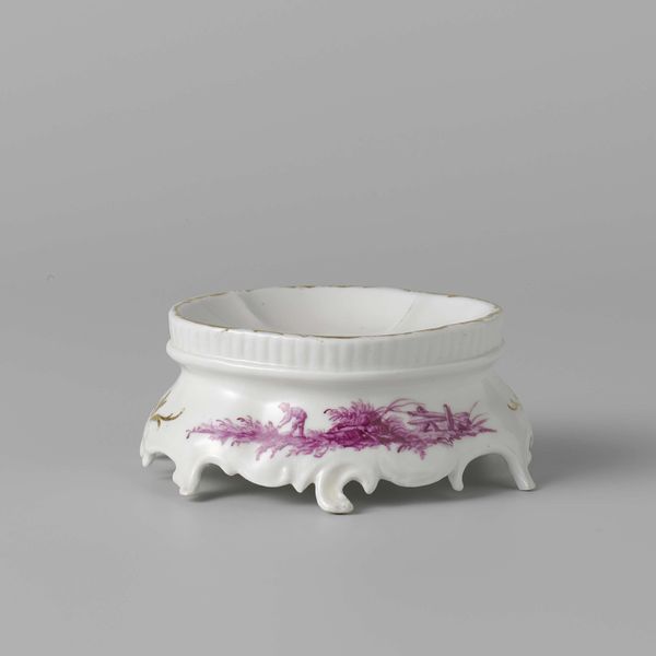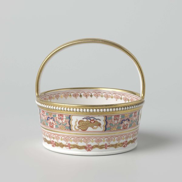 Curator: The work before us is titled "Fruitmand van porselein," a porcelain fruit basket crafted in the manufactory of Loosdrecht between 1774 and 1784. Note the Rococo elements of the piece. Editor: My initial impression? Delicate. Almost like it shouldn't be touched. All that pristine white and lacy design screams, "look, but don't breathe!" Curator: Indeed. The porcelain, so characteristic of the Rococo period, achieves a certain ethereal quality. Note the interplay of solids and voids in the basket's woven structure. The gilding too enhances that fragility. Editor: Absolutely, that gold trim dances on the edge of the impossibly fine porcelain and those tiny blossoms. It's like someone tried to capture a fleeting summer moment in clay. I'd be terrified to put actual fruit in it. More like sugarplums or maybe candied violets? Curator: Your perspective resonates with the period's penchant for aristocratic pursuits and the aesthetic of pleasurable living. What the artist is trying to articulate are ideas and philosophies of beauty and transience through delicate forms, and carefully distributed floral elements that punctuate the object. The handles offer a visual interruption, directing your eye through the piece. Editor: But is it practical, though? Seems more like a celebration of itself than an actual useful object. Kind of makes you wonder if some pampered noblewoman ever used this or if it was just an objet d'art for show. Curator: Function is not paramount here; this fruit basket is instead a manifestation of craft. A complex lattice-work which represents this refined form, embodying not just a useful form, but the decorative flourishes that suggest elegance and prestige. The very notion of the Rococo suggests that everything should be beautiful, from buildings and furniture to smaller domestic objects. Editor: Which it succeeds at brilliantly, I think. It is a feast for the eyes and really encapsulates its era through design and material. A glimpse into a powdered-wig past. Curator: And, at the end, its enduring allure perhaps is simply about how an object's artistic purpose manages to capture not just attention but an emotion from generations on. Editor: A precious testament, a time capsule made of porcelain. Definitely evokes a sense of nostalgia.