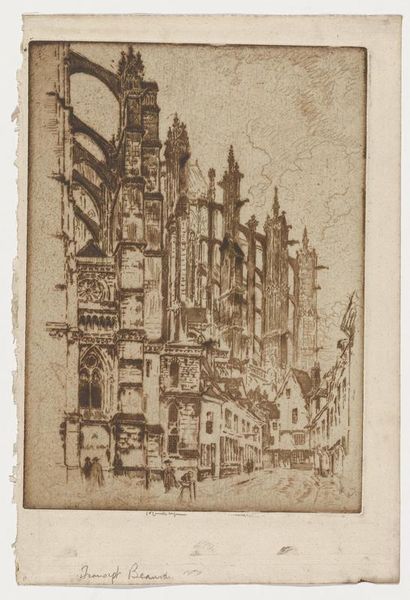 Curator: Let’s consider “Skyscrapers of Menton,” an etching created in 1930 by Samuel Chamberlain. Editor: It feels…dense. The buildings almost seem to be pressing in on each other, a kind of architectural claustrophobia. Curator: Observe how Chamberlain manipulates light and shadow through densely packed lines. He's really interested in creating depth through the contrast of dark crevices and stark highlights. Editor: I'm immediately drawn to how the city, likely meant to represent progress and civilization, appears almost decayed. Considering the global socio-political climate of 1930, there's a sense of unease baked into the very architecture. Were these ‘skyscrapers’ symbols of failing systems? Curator: Fascinating interpretation. Notice the intricate detailing throughout the building facades. He masterfully uses hatching and cross-hatching to define each individual brick, window, and architectural ornamentation. Editor: And even with all those details, there's a feeling of crumbling. This city could speak to the rapid urban development happening in many places after the First World War, which left communities fragmented and struggling to catch up. Curator: The composition itself presents a visual tension. The buildings crowd the upper portion of the picture plane, while the open foreground creates an expansive, almost inviting public space. Editor: Almost inviting, but subtly distanced. Perhaps that's where the heart of its message lies: how public spaces appear accessible, yet maintain underlying barriers for certain individuals and groups within the community. This prompts us to confront who benefits and who's excluded from the narrative of urban prosperity. Curator: What I find remarkable is how he turns architectural forms into a study in texture, emphasizing surface and light effects to render depth and three-dimensionality on a flat surface. Editor: The artist has masterfully combined realism and evocative visual messaging in “Skyscrapers of Menton," sparking complex reflections on urban space, the state, and those inhabiting those spaces. Curator: I leave this conversation impressed with how deeply the interplay of technique and texture allow this cityscape to resonate so richly.