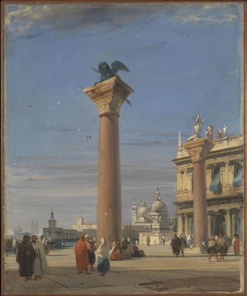 Curator: Canaletto, known for his Venetian cityscapes, likely created this vista, "Bacino di S. Marco from the Piazzetta", using oil paints. What is your first impression? Editor: An air of quiet dignity, almost serene, despite the bustle I imagine existed in reality. The soft, pale colors add to that feeling. Curator: Indeed. It is a masterclass in perspective and light. Notice how Canaletto painstakingly renders the architecture – the Doge's Palace, the columns of San Marco – emphasizing Venice as a hub of power and commerce. Editor: And what about the winged lion atop one of the columns? That symbol alone evokes centuries of Venetian history, a legacy of maritime strength and artistic achievement. And there's also the other figure on the left-hand side. They both stand proudly guarding this floating city. Curator: Certainly. But let’s consider the material reality of Venice itself. This image is a carefully constructed commodity, made for wealthy tourists seeking a souvenir of their travels. Canaletto, operating almost like a workshop, efficiently produced these views, exporting images of Venetian identity for external consumption. Editor: Yet these aren’t simply postcards. They are meticulously crafted depictions loaded with symbolism. Take the sea itself—the ever-present water not only signifies Venice's unique position as a trading port, but also carries connotations of fluidity, adaptability and perhaps even vulnerability. Curator: Vulnerability yes, that’s key. The foundation of Venetian wealth – its control of trade routes – was fragile. By the time Canaletto was painting, Venice was losing its dominance. The image both celebrates the city's grandeur and, perhaps unwittingly, documents its decline. Note also the very organization of labor along the portside: this piece highlights an increasingly unequal access to production and resources. Editor: The contrast between the imposing architecture and the ordinary people going about their daily business strikes me. Canaletto’s perspective reminds the patrons who buy this work of the powerful, established hierarchies that dominate Venetian life. Curator: Precisely. Each element carefully considered in the light of class, labour, and production value, carefully exported for maximum monetary advantage. Editor: Thinking about all of these symbolic layers and contextual references makes appreciating "Bacino di S. Marco" an immersive experience. It's so much richer than a simple snapshot. Curator: Yes, a manufactured and symbolic export item representative of a precise period.
