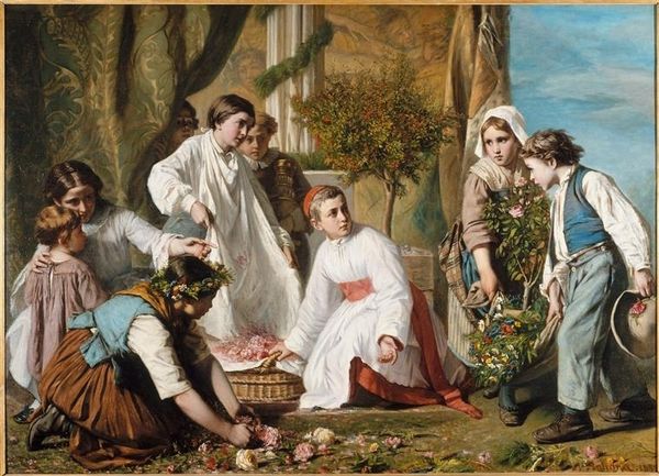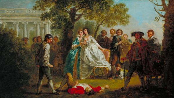 Editor: Here we have Daniel Maclise's Scene from ‘Twelfth Night,’ a dramatic oil on canvas. It strikes me as a rather theatrical tableau. What do you see in this piece? Curator: The painting breathes with the spirit of Shakespeare, doesn’t it? Maclise really captures the play’s absurd humor and social commentary. That garden feels almost like a stage set, doesn't it? Editor: Absolutely. It's like we’re peeking into the scene. I hadn’t thought of it that way. Curator: Exactly! And the colors, bold and bright, amplify the exaggerated emotions. Consider Malvolio's costume; it's practically screaming for attention! It’s a beautiful blend of observation and invention. It makes you wonder what Maclise thought of ambition and folly. Editor: It does make you wonder! Thanks, I’ll definitely be thinking about that.