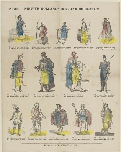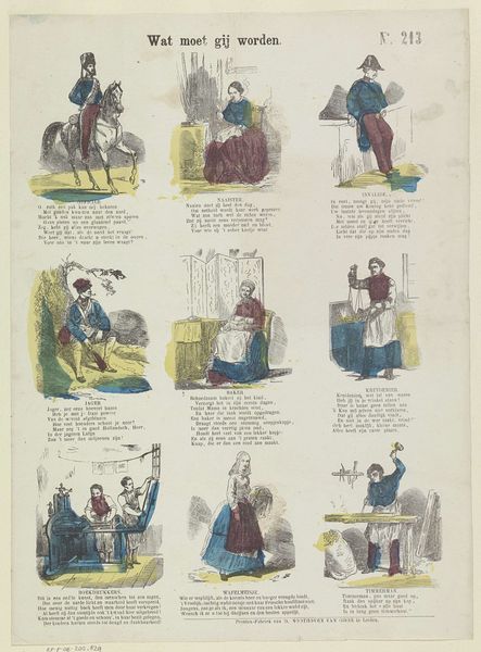 Editor: So, this is "Straatverkopers te Parijs," or "Street Vendors in Paris," by Victor Adam, made in the early 1830s. It looks like it's a drawing with colored pencil, maybe even a print. It's really a snapshot into everyday life. What do you see when you look at this piece? Curator: I see a very calculated construction of labor. These aren't just quaint scenes of Parisian life; they're carefully chosen representations of various trades. The artist uses the print medium to make this accessible to a broad public, potentially reinforcing or even shaping perceptions of class and labor divisions. Look at how each figure is defined by the tools and products of their work – their materiality. Editor: That’s interesting! I was focusing more on the outfits and the interactions between the vendors and the customers. So, you're saying the very act of creating this as a print makes a statement? Curator: Absolutely. The means of production – drawing, coloured-pencil, printmaking – determine the work's accessibility and, consequently, its potential impact on social consciousness. Think about who would have commissioned, produced, and consumed this kind of imagery, and what social narratives were being perpetuated by portraying these individuals in this way. What's the social role of representing labour, and then selling representations of it? Editor: So, it's not just *what* is being shown, but *how* it was made, and *who* it was made for that gives it meaning. The print medium itself is significant. Curator: Precisely. We have to consider the means by which this image reached its audience and the cultural and economic forces at play in its dissemination. Editor: I never thought of it that way before. I was just thinking of it as a historical record. Thanks, that’s given me a lot to think about. Curator: My pleasure. Always consider how materials and process are integral to understanding a work's significance.