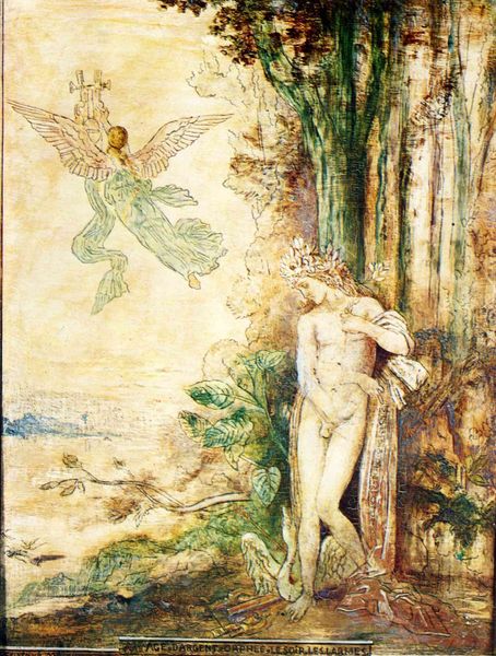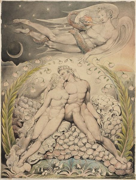 Curator: Oh, this has such a dreamlike quality. It feels ethereal, doesn't it? Like peering into a faded memory. Editor: You're right, it possesses a certain delicacy. What we're looking at is William Blake's "Archangel Raphael with Adam and Eve", a watercolor completed in 1808. The narrative obviously deals with a key moment from the Book of Genesis, but his interpretation is fascinating. Curator: Fascinating is an understatement. Look at how Raphael, crowned and almost encased in flames, points upward, seemingly directing or warning them. He is usually associated with healing, but here he seems more like an austere judge. And the postures—Adam, sitting almost dejected; Eve, hesitant but also proud of her fruit. There's so much contained tension. Editor: Blake's work often contains complex iconography. Here, Raphael's positioning and the visual framing recall the concept of divine judgment, or perhaps divine intervention into human affairs. Note the sinuous curves around the figures, mirroring the shape of a proscenium arch, implying we’re observing a staged drama. Curator: And the tree of knowledge heavy with forbidden fruit in the background... it's all quite… foreboding. Blake was such a unique figure. A visionary, poet, painter...He really blurred the lines, didn’t he? Editor: Indeed. And if you look closely at the details of his figures, especially their musculature, they pull inspiration from classical sculpture while incorporating his own, very singular, artistic vision. The romantic ideal mingling with a personal symbolism... fascinating and yes, absolutely foreboding. It is an invitation to reflect on themes of transgression, knowledge, and perhaps the inherent contradictions within the human experience. Curator: It certainly does stay with you. It whispers of grand stories and personal journeys. A testament to Blake's enduring power to stir our souls. Editor: A haunting reminder that symbols often contain layers of meaning that are timeless in their resonance.