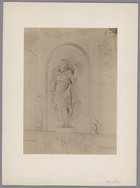 This photograph shows a corridor in the Huis ter Meer in Maarssen, captured by an anonymous photographer. There's a hazy quality to the image and, combined with the pale tones, it feels like the record of a dream. The photo focuses on the architectural details, especially the stucco work of classical figures adorning the walls. The photograph is not just a depiction of space, but also an exploration of texture. Look at the way the light catches the raised surfaces of the stucco figures, giving them a ghostly presence. It feels like the photographer is interested in the push and pull of the surface as much as the illusion of depth, with the doorways fading into the distance. The soft focus and limited tonal range create a sense of timelessness, as if the photograph itself is aging like the stucco it depicts. I'm reminded of Eugène Atget's photographs of Paris, documenting the city's architecture with a similar sense of quiet observation. Both share a sensitivity to light, and the ability to find beauty in the everyday.