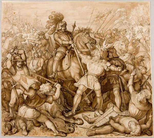 Charles-Philippe Lariviere’s "Battle of Castillon" is an oil painting capturing a historical clash. Notice how Lariviere used layers of paint to build up the scene, creating texture and depth. The thickness of the pigment varies, with some areas smoothly blended and others roughly applied, especially in the chaotic clash of figures and horses. This not only adds visual interest, but also captures the energy of combat. The detailed rendering of armor, weapons, and textiles speaks to the artist's skill and the cultural significance of these objects. Consider the labor involved in producing the actual arms and armors, and how Lariviere translates this craftsmanship onto the canvas. The materiality of paint here echoes the materiality of war. It serves as a reminder that the making of an image is not so different from the making of a sword. Both require technical expertise, physical effort, and social investment. By paying attention to material and process, we can appreciate how even a traditional painting can reveal wider social and historical contexts.