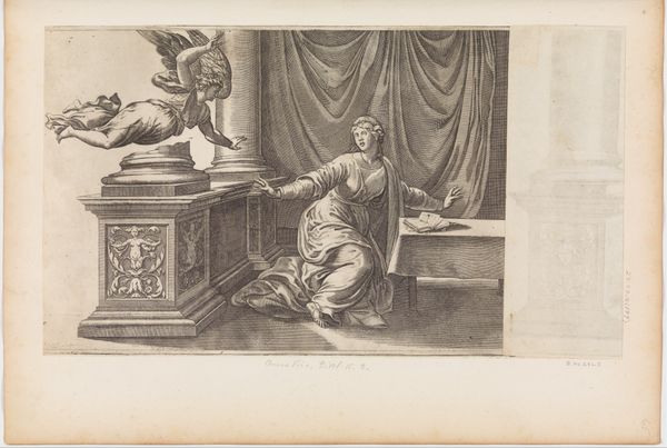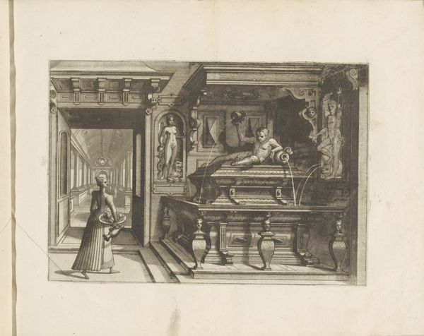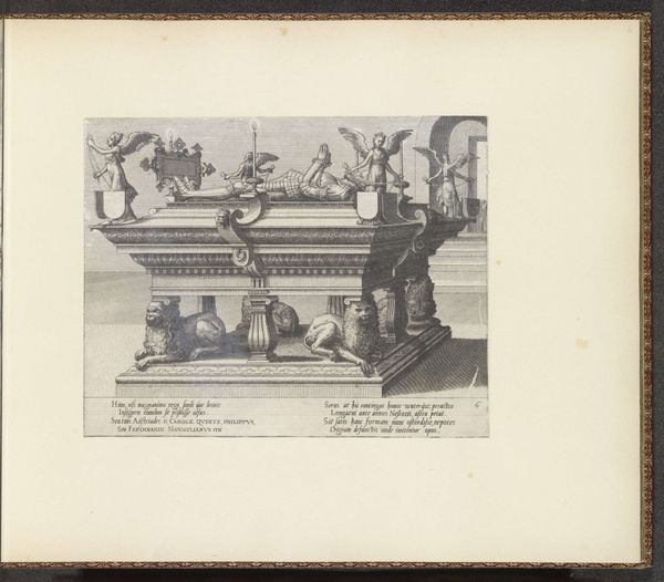 Curator: At first glance, the elaborate design of the tomb radiates nobility, and solemn beauty. Editor: And the strangeness. We're looking at a 1563 engraving titled "Vrijstaand grafmonument voor een man, met twee wildemannen," created by Johannes or Lucas van Doetechum. It's a free-standing tomb monument featuring two wildmen, now residing at the Rijksmuseum. But beyond that elaborate description, there is an overwhelming presence. What exactly stands out? Curator: For me, it's the almost theatrical grandeur. A raised tomb with a sculpture of the deceased. Figures that appear both sorrowful and celebratory. The presence of these "wildmen" is intriguing. What's their role here, as symbolic guardians perhaps? Editor: Exactly! Wildmen, or "wild people," are recurring figures in European art and folklore. They often represent the untamed, primal aspects of humanity. Think of them as a visual bridge between civilization and nature, mortality and the afterlife. Curator: Fascinating. So they're protectors, representing primal strength and endurance. But then why include such untamed figures alongside such formal Renaissance elements? It’s a really intense juxtaposition. Editor: The Renaissance was obsessed with both classical order and the mysteries of the natural world. Placing wildmen next to symbols of high society creates a powerful visual tension. The architecture feels so stable but teems with smaller creatures climbing around as if they want to reclaim it. What's really unnerving, and brilliant, is how it's all packaged into such a formal commemoration of loss. Curator: This engraving almost acts as a miniature stage for grief, memory, and the struggle to reconcile ourselves to life and death. The overall effect is strangely affecting. It lingers with you in the mind. Editor: It's a potent reminder that even within the most elaborate attempts to control and commemorate, the wild, untamed aspects of life, and death, are always present. The print certainly does invite deep reflection.