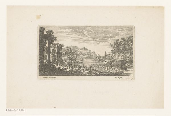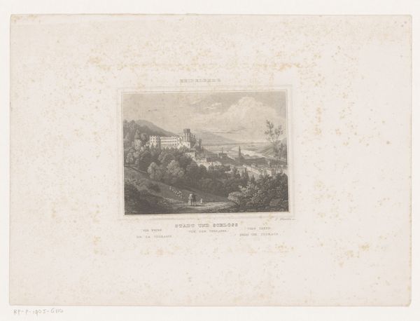 Editor: So, we're looking at 'Gezicht op Montpellier met reizigers,' or 'View of Montpellier with Travelers,' an etching by Johann Gabriel Friedrich Poppel, dating from 1835 to 1863. It has this incredibly serene, almost hazy quality. It really makes me think about old travel journals. What leaps out at you when you look at this print? Curator: Well, the tranquility definitely strikes a chord. But I can't help feeling the ghost of human activity thrumming through the whole composition. See how the people are sort of nestled *into* the landscape? Like they are these integral yet unassuming actors in its story. The landscape provides a certain… I don't know, does ‘gravitas’ seem right? Do you get that, or am I just off on a tangent? Editor: I get the feeling for sure! It’s a pretty flat horizon line overall but also a high point of view—it feels more like Poppel wanted to show us a snapshot, as opposed to this grand vista. Curator: Precisely. It feels… intimate despite its scope, right? What I see, I suppose, is this very personal vision, less interested in the landmark Montpellier itself, more consumed with Montpellier as this living, breathing backdrop for… people, life, moments! Editor: I never would have noticed that on my own. Curator: It makes you wonder, doesn't it? Who were these travelers, and what were their stories? It's a glimpse into a world bustling with quiet journeys, you know? Editor: Totally, almost like they're frozen in time right before our eyes, and maybe poised to begin some long, important trip. Curator: Beautiful. Absolutely beautiful. I feel like you are well on your way toward something bigger, something real!
