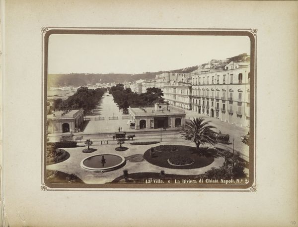 Giorgio Sommer created this photograph titled "Villa Nazionale" sometime between 1834 and 1914. The composition is dominated by a formal garden in the foreground, structured with geometric precision. The interplay of light and shadow across the stone buildings and the natural elements creates a textured surface, inviting a visual exploration of depth and space. The photograph's structure presents a dialogue between the ordered, cultivated space of the garden and the more amorphous, natural landscape in the background. Sommer uses the photographic medium to explore themes of control and perspective, contrasting human-imposed order with the irregularities of nature. The lines of the buildings and pathways converge, guiding the viewer's gaze toward the horizon, while the circular garden plots offer a counterpoint to the linear perspective. Consider how the formal arrangement might reflect broader philosophical concerns about the relationship between humanity and nature, and the tension between ideal forms and the complexities of the real world.
