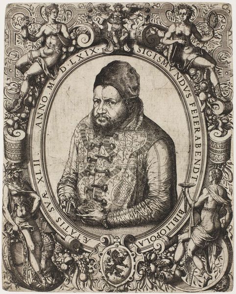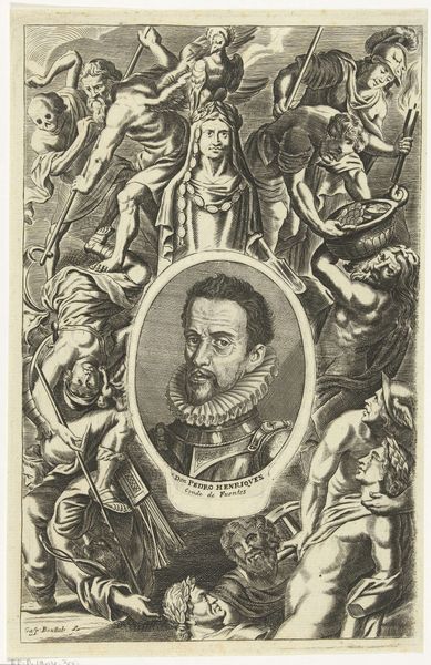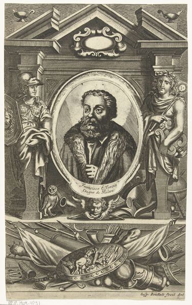 Gaspar Bouttats created this portrait of Maximiliaan, Count of Buren, sometime in the late 17th century using etching techniques. The print is more than just a likeness; it’s a carefully constructed image designed to convey the Count's status and virtues within the rigid social hierarchy of the Dutch Republic. The elaborate allegorical frame, featuring classical figures and symbols, speaks to the cultural values of the time. Note how the Countess's virtues and lineage are presented through these visual codes, reflecting the importance of family and nobility in Dutch society. This imagery serves to legitimize the Count's position and reinforce the prevailing social order. To fully understand this work, we can consult genealogical records, historical accounts of the Buren family, and studies of Dutch aristocratic culture. By examining the social and institutional context in which this print was made, we gain a deeper understanding of its meaning and significance.