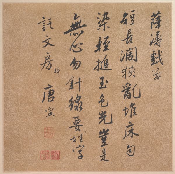 Ishikawa Godō created this Autumn Poem using ink on paper sometime before his death in 1852. In Japan, calligraphy has long been considered a high art form, not just a means of communication. Consider this work in the context of the Edo period, which was defined by rigid social hierarchies under the Tokugawa shogunate. While ostensibly a poem about the autumn season, calligraphy like this also conveyed social status. Mastery of brushstrokes and familiarity with classical literature indicated a high level of education and refinement. The red seals, or chops, are also significant. They act as signatures, marking the work as authentic and adding another layer of meaning. They assert the artist's claim to authorship but also connect him to a lineage of calligraphic tradition. To truly understand this work, we might turn to historical texts on calligraphy, social histories of the Edo period, and biographies of Ishikawa Godō. Only then can we grasp the full meaning of this seemingly simple poem.