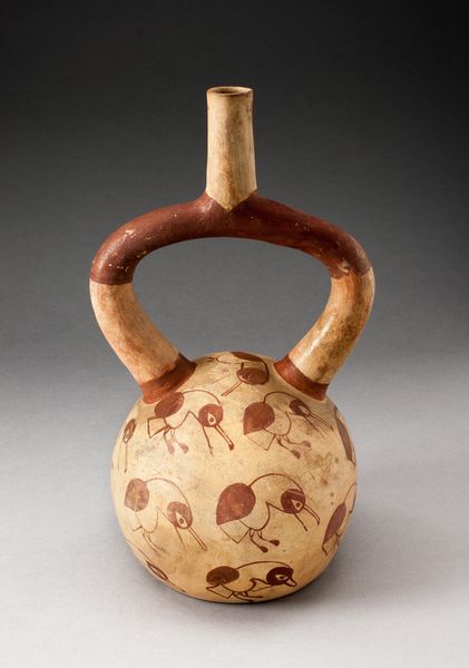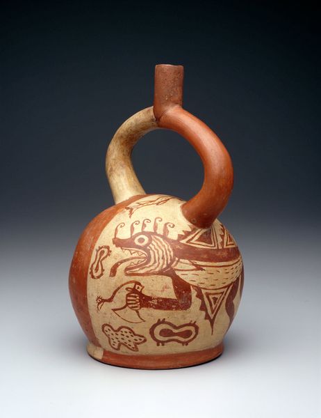 Editor: Here we have the Moche "Stirrup Spout Vessel Depicting Runners," crafted from ceramic sometime between 100 and 500 AD. The scene etched onto it is very striking. There's a real sense of movement despite being static. How do you interpret this work? Curator: This piece speaks volumes about Moche society, particularly their rituals and social structures. Notice how the figures are rendered. They are participating in what seems like a ritual race. The Moche often used these vessels to depict scenes of warfare and elite competition, so these runners likely represent something more significant than just a sporting event. Editor: More significant, how so? Curator: Consider the stirrup spout itself. Its unique shape isn't just practical for pouring liquids; it’s also a powerful symbol. It appears in many important ceremonial contexts. Ask yourself, what emotional or cultural weight does repeated imagery like this hold for the Moche people? These races probably relate to power, endurance, or even sacrifice, connecting physical prowess to spiritual significance. Editor: So, it’s not just a decorative scene, it's laden with symbolism related to power and ritual. The repetition creates a cultural memory? Curator: Precisely. The repeated motif reinforces their cultural beliefs. How does it make you think about our own society and how we preserve our beliefs? Editor: That’s really interesting. I’ll definitely look at similar vessels in a new light now. Thanks! Curator: My pleasure! Always look beyond the surface and delve into the meanings that these symbols held, and continue to hold today.