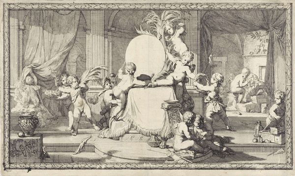 Editor: Here we have "Cartouche with allegory on a marriage" by Jan Caspar Philips, an engraving from sometime between 1736 and 1775. The scene feels very staged and theatrical, and I am curious about all the symbolism going on. How do you interpret this work? Curator: The “staged” feel is characteristic of Baroque allegory, often commissioned to project power and legitimacy. Look at the central couple being presented as if on stage. The institutional authority of marriage is being reinforced through its portrayal, but also consider *who* that portrayal is for. Does it reinforce existing hierarchies? Editor: It definitely seems like the image is directed at a particular social class. Is that what you mean by hierarchies? Curator: Precisely! Notice the composition is split into distinct areas, from the main event with the wedding, framed as most important; it features a formal scene above, maybe meant to convey a godly event, that lends legitimacy to the marriage and, thereby, legitimacy to inheritance. What are your thoughts about this portrayal of power? Editor: That makes me think about how carefully these images had to be crafted in order to maintain the proper appearance for the elites. It almost seems like the artist is negotiating or, maybe, struggling with, existing power dynamics by depicting them. Curator: Indeed! The artist simultaneously served and shaped societal values, working within institutional constraints while expressing creativity and subtle social commentary. Images such as these were a key instrument for self-fashioning of the upper class. So, while the piece initially strikes you as somewhat stilted or “staged,” do you now perhaps view the image slightly differently? Editor: I think so! It feels a lot less like just a pretty picture now that I realize how the scene and framing are intended to reflect authority, wealth and maybe a slight political undercurrent. Thank you. Curator: My pleasure, it’s these complexities that make art so rewarding to study!