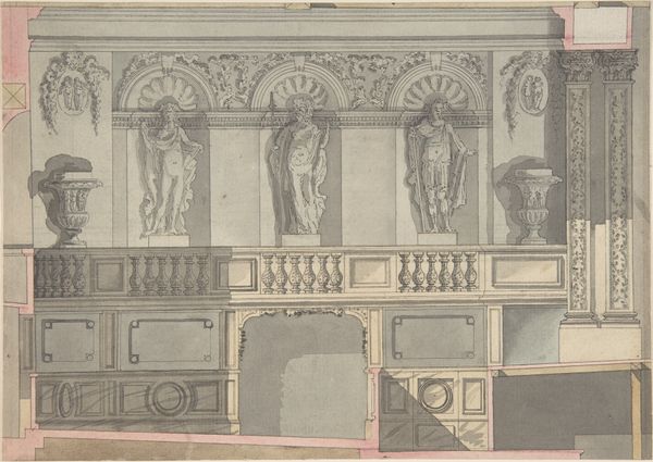 Peter Cramer, in the 18th century, created this watercolor and pen drawing, "Et kabinet," which translates to "A Cabinet" or "A Room." At first glance, it appears to be a simple depiction of an ornate interior, but it speaks volumes about the era's obsession with control and order. The symmetry and classical motifs reflect a desire to impose structure on both the physical and social worlds. Consider the role of the "cabinet" in the 18th century - a private space for contemplation, conversation, and the display of wealth and taste. It was a stage upon which social identities were performed and reinforced. Look at the portraits adorning the walls, possibly those of aristocratic figures; they remind us of the power dynamics inherent in such spaces. Who was allowed in, and who was excluded? What conversations took place, and whose voices were silenced? Cramer's drawing serves as a reminder of the complex interplay between art, power, and identity in the 18th century. It invites us to consider the ways in which spaces shape our experiences and perceptions of the world, and how these spaces are, in turn, shaped by the social forces that govern them.