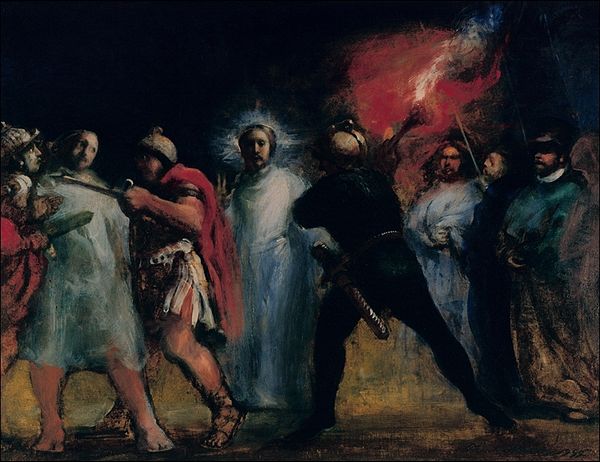 Wilhelm Marstrand captures a deeply unsettling moment with oil on canvas. In the foreground, Judas betrays Jesus with a kiss, an act that serves as a prearranged signal for the soldiers to arrest him. The kiss, ostensibly a sign of affection and loyalty, here becomes a symbol of deceit and treachery. Consider how the motif of the kiss recurs throughout art history, often carrying connotations of love and intimacy, yet here it is twisted into its antithesis. It reminds me of the deceptive embrace of mythological creatures like the sirens, whose beauty concealed deadly intentions. This betrayal plays on the subconscious, tapping into our primal fears of deception and the fragility of trust. It's a motif that has been replayed across time, evolving to reflect shifting cultural anxieties, yet always retaining its power to disturb and disorient.