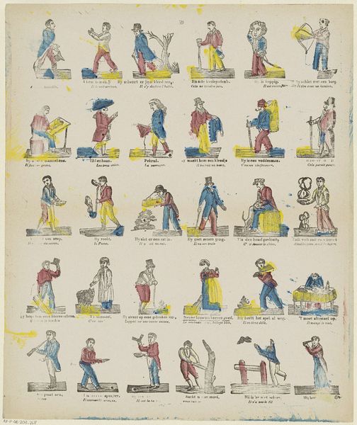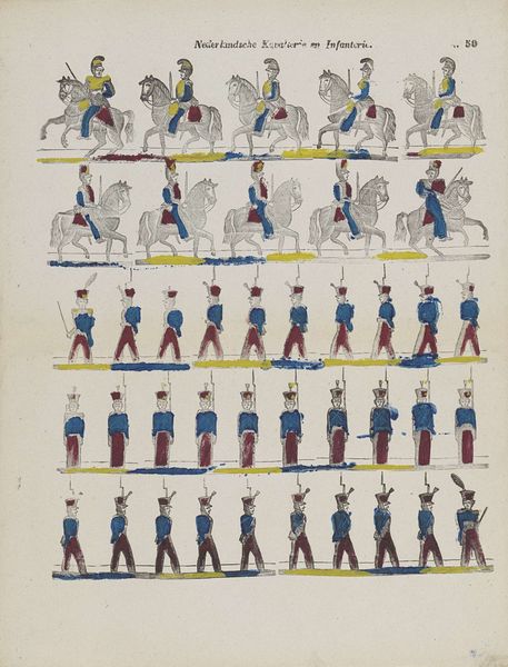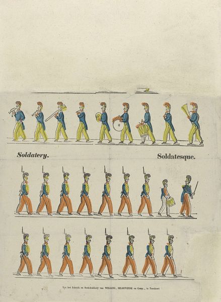 Editor: So, this lithograph, “Kinderen! Kiest gy 't militaire leven, / Hier kunt gy uwe keus genoegen geven" made by D. Lijsen sometime between 1836 and 1849… it’s a print of soldiers, seemingly aimed at children, and something about the rather simple application of colour gives it an instructional feel. What strikes you most about it? Curator: I'm immediately drawn to the methods of its production and dissemination. Lithography allowed for relatively inexpensive reproduction. Think about the intended audience: children. And consider the societal context. The Netherlands had recently been part of the Napoleonic Empire and then the Kingdom of the Netherlands. What impact did militarization have on Dutch society and popular imagination during that period? How were military professions depicted? Editor: So, the print isn't just the final image, but a product of social and economic forces that enabled it, and which it in turn reinforced? How does this all connect with its child audience? Curator: Exactly. It becomes fascinating when you examine the role of children as consumers of these images. What are the labor practices involved? Consider who printed it, who sold it. What sort of workshop environment was it manufactured in? Moreover, we should also question how the material simplicity of the print influenced the perception of military life in those formative years. Do you think the simple execution affected the popularity or reception of this print? Editor: I never thought about it like that, considering it a physical object, made through labor, as part of the business and ideology. Now, the relatively simple process, use of color, and child audience speaks much louder. Curator: Right, and remembering those aspects challenges the distinction between mere 'illustration' and capital 'A' art, prompting questions about craft and labor itself. Hopefully it gives you another thing to look for when examining artwork in the future!