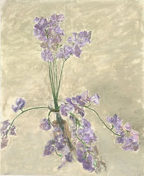 Piet Mondrian painted "Irises" with oil on canvas, sometime before he got all into the grid. Look at how he's put down the color, yellow layered with ochre in long vertical strokes, almost like he's blocking in the tones, and the shapes of the flowers in pale blue. It's all about process, like he's figuring it out as he goes along. There’s a real sensitivity to the materiality of paint here, the way the colors interact, the roughness of the strokes, that gives the painting its energy. Take a look at the top left corner, there’s a stroke of pure pale blue just on the edge of the petals, where it meets the yellow ground. It gives the flower its form, but it also speaks to the painting as an object, not just a representation. You can see that Mondrian is already moving towards abstraction, looking at the formal elements of painting, the lines and colors themselves. You could say this connects him to painters like Marsden Hartley, also doing a kind of representational work that’s really about the stuff that paint can do. It's all about embracing ambiguity, letting a painting be a bunch of things at once.