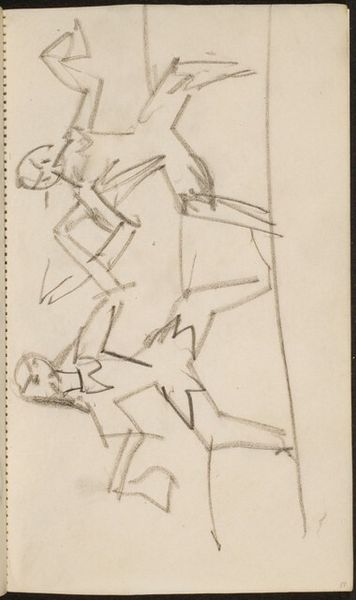 Editor: This sketch, "Dancers on a Stage," by Max Beckmann, appears to be a preparatory drawing done in pencil. It’s very gestural, and the figures seem caught in motion. It feels raw, immediate. What strikes you when you look at this, how do you interpret this work within its broader context? Curator: This sketch embodies a fascinating tension, doesn't it? On one hand, it's expressionistic, raw, as you said. Beckmann, of course, was working in Germany during the interwar period, a time of immense social and political upheaval, when the Weimar Republic struggled with its democracy, economic struggles, and right-wing extremism. Editor: Right. Curator: And expressionism, as an artistic movement, was a reaction to this chaos and an outlet to question those issues. But notice the subject matter, the dancers on a stage. What sort of expectations of traditional roles do performance and spectatorship highlight for you? Where does the freedom of the stage sit against the background social instability of the era? Is this escapism, a kind of resistance, or both? Editor: I hadn't considered it as a commentary on escapism or even resistance. I saw it more as a snapshot. I wonder what kinds of stages the artist experienced in Weimar Berlin? Curator: Exactly! And how those stages mirrored or challenged the social dynamics outside the theater walls? Thinking about these performance spaces helps reveal the nuanced dialogue between art and its historical moment, particularly through a gendered lens of who is watching whom, who has the power to be viewed or heard. It pushes us to think about art as inherently political, even when it depicts something as seemingly innocuous as dancers on a stage. Editor: That is very insightful; looking at art as an inherently political medium is fascinating.