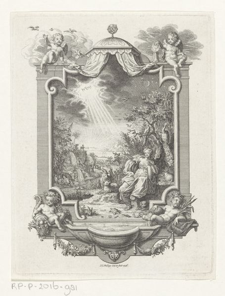 Editor: Here we have "Twee vrouwen met parasol" – "Two Women with Parasol," from 1745, made by Carl Albert von Lespilliez. It's an engraving, and what immediately strikes me is the elaborate Rococo frame around the central scene. The composition seems intentionally divided – is that framing just decorative, or does it impact our reading of the subject matter within? Curator: Indeed, the frame is integral, not merely ornamental. Observe how the asymmetry, a key characteristic of Rococo, plays out in both the internal landscape and the external flourishes. The frame's curvilinear forms mirror the natural forms within, creating a visual echo that binds the piece together. Consider the placement of the sun at the top; it sheds light, yes, but also functions as a compositional keystone. How does its presence affect the tonal relationships within the depicted scene? Editor: It makes me think about hierarchy...the sun being visually superior to what's beneath it? It’s almost like the artist is directing us. Curator: Precisely! And note how the artist manipulates positive and negative space. The density of the foliage in the upper corners contrasts sharply with the open, almost empty space intended for text at the bottom. This tension isn't accidental. What effects do you believe the artist was seeking to elicit? Editor: Perhaps to give our eyes a break...or to give the engraving a sense of visual balance? The light and dark are definitely key. Now that I'm considering the composition, I see the positioning of the figures too – they also follow a set pattern. Thanks, this was enlightening! Curator: My pleasure. Applying a formalist lens reveals how seemingly disparate elements collaborate to create a unified aesthetic experience, inviting the viewer into a continuous interplay between the representational and the abstract.