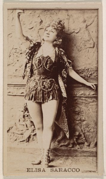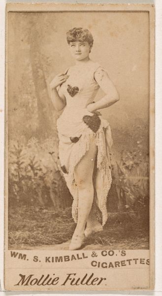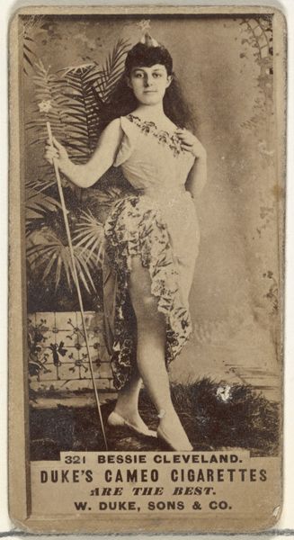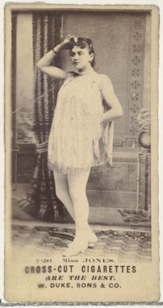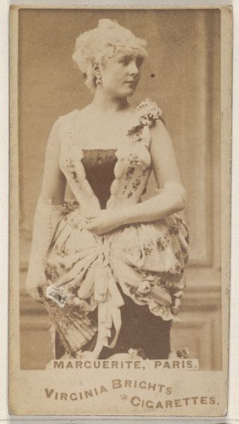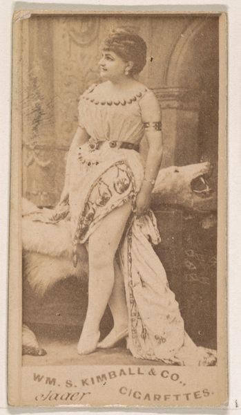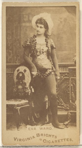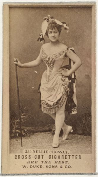This is a photograph of Mlle. Chattairy, a Parisian actress, made by Goodwin & Company in the late 19th century as part of an advertising series for Old Judge Cigarettes. This belongs to a wider cultural context, where commercial imagery was becoming pervasive. Cigarette cards like this were cheap, mass-produced images that were collected, traded, and often reflected contemporary values and ideals. Here, the figure of the Parisian actress is presented as glamorous and exotic, appealing to the consumer’s aspirations for sophistication and worldliness. The image is designed to create meaning through specific visual codes. Consider the actress's elaborate costume, which hints at the spectacle of the theater, and the "Paris" designation in the title, which invokes the city's reputation as a center of fashion and entertainment. The history of photography and commercial advertising are crucial to understanding this image, as is the rise of celebrity culture. To truly understand this artwork, we would need to research the careers of actresses like Mlle. Chattairy and the advertising strategies used by tobacco companies at the time. The meaning of art is contingent on its social and institutional context.