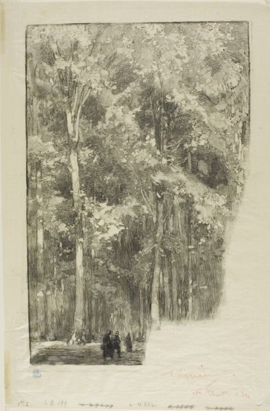 Editor: Here we have Peter Becker's "Young high forest" created in 1897. It's a graphite and pencil drawing. The subdued tonality evokes a sense of quiet solitude, a peaceful refuge almost. What do you make of this seemingly simple forest scene? Curator: I see the romantic soul gazing into the self, mirrored in the seemingly infinite space of the forest. Look at how Becker uses light, not to illuminate, but to suggest a deeper, almost spiritual connection between the viewer and the natural world. What sort of mood does this evoke? Editor: Definitely one of introspection. The trees reach upwards, perhaps symbolizing aspiration, while the path seems to disappear, hinting at the unknown. Is there more to it than just pretty trees? Curator: Forests have historically been places of both fear and wonder, spaces where societal rules dissolve. Does the delicate graphite medium further enhance the fleeting, transient quality of human emotion and our connection with nature? What sort of symbolism did trees have at the time, especially within the context of burgeoning industrialisation? Editor: I hadn't considered that contrast. Perhaps the forest serves as an escape from the encroaching modern world, a reminder of something timeless and pure. It's interesting how Becker doesn’t offer a clear path; it’s more about being lost in the experience. Curator: Precisely! It is a deliberate gesture away from societal constructs and control. We’re reminded of our insignificance and our profound interconnectedness. And does that inform our cultural memory? Editor: Yes, that gives me a deeper appreciation for the symbolism present. The forest then becomes less a physical place and more a space for inner exploration and a reflection of humanity’s complex relationship with nature. Curator: Absolutely! A dense weave of visual symbols indeed.