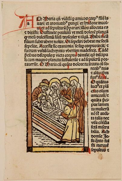 Curator: This "Illustration XIV," an anonymous piece from the Harvard Art Museums, presents a fascinating scene. The colours, though somewhat faded, still convey a sense of drama. What jumps out at you? Editor: The composition feels quite busy, with text crammed around the central image. It gives off a rather oppressive vibe, if that makes sense. What do you see in this piece? Curator: I think your 'oppressive' is spot on. To me, it seems to depict a moment of judgment or perhaps even torture, judging by the body language. The artist’s lack of a signature allows the viewer to focus on the scene’s raw emotion. Editor: I see that now; it does have a strong emotional charge. Thanks for helping me appreciate this piece more deeply!