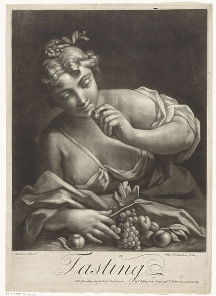 Alexander van Haecken created this mezzotint, “Gehoor” or “Hearing,” sometime in the early 18th century. The composition is dominated by the figure of a woman, centrally placed, her gaze lowered as she holds a mandolin. The tonal gradations achieved through the mezzotint technique lend the image a soft, almost dreamlike quality. The rendering of texture is particularly noteworthy, from the delicate feathers adorning her hair to the folds of the drapery that loosely cover her form. Haecken employs light and shadow to sculpt the figure, creating a sense of volume and depth within the two-dimensional plane. This work functions as an allegory, representing one of the five senses. In its formal construction, Haecken engages with broader artistic concerns of the period, such as the representation of ideal beauty and the exploration of human perception. The print invites a prolonged viewing, during which the interplay of light, texture, and form reveals itself as a site of ongoing interpretation.