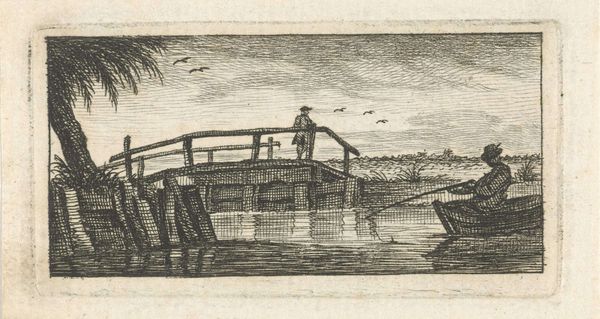 Curator: Esaias van de Velde's "Farm to the Right of a Canal" presents a pastoral scene etched with remarkable detail. I'm immediately struck by the sense of tranquility despite the humble, almost stark, subject matter. Editor: The etching technique certainly lends a certain austerity. Velde, active in the early 17th century, was working in a Netherlands undergoing significant social and economic shifts. One wonders if this simplicity is a reflection of the changing relationship with the land. Curator: Or perhaps it’s a deliberate stylistic choice. The stark lines create a compositional balance between the architecture and nature. Notice how the well's sharp angles are echoed by the lines of the farmhouse, subtly offset by the organic shapes of the trees and figures. Editor: Indeed. The figures, rendered so simply, appear almost staged, prompting questions about the relationship between labor, leisure, and social class in the Dutch landscape. The woman seated and the man standing evoke societal hierarchy. Curator: I find it compelling how such a small piece, just over 7 centimeters in height, invites such broad consideration. Editor: Absolutely. Art invites us to examine not just its visual elements but also the narratives it subtly conveys.