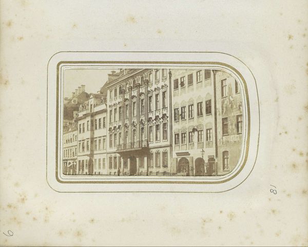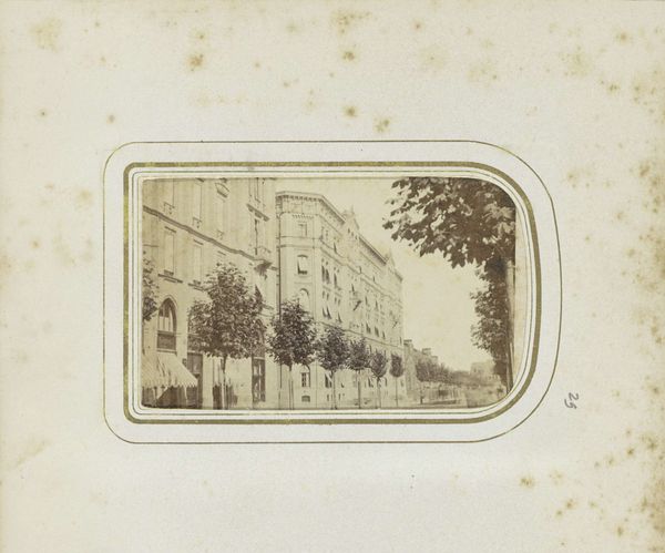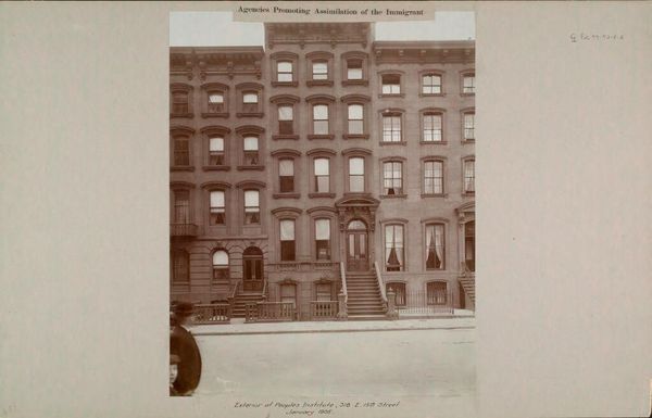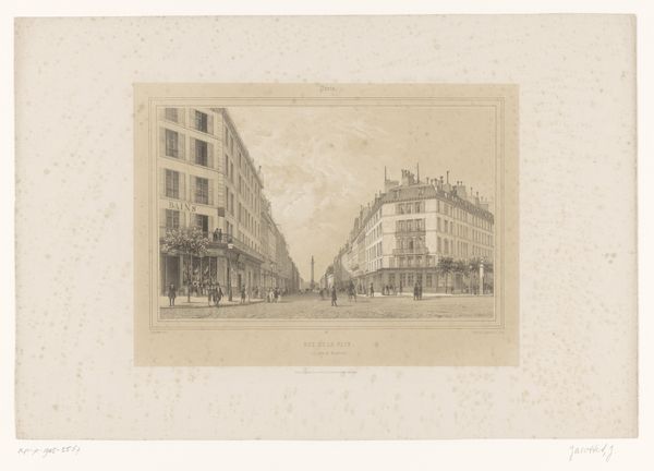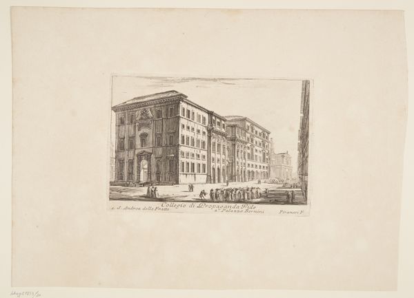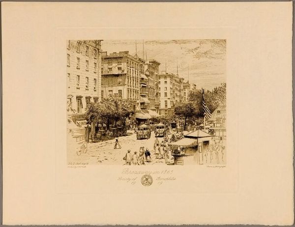 Curator: This is Sidney L. Smith's "Astor House, Broadway, 1867," an etching. Editor: It feels so still, yet bustling. Like a memory carefully preserved, that grand hotel standing sentinel. Curator: The Astor House was indeed a landmark of its time, a symbol of wealth and progress in a rapidly changing New York. Look at the detail—the horse-drawn carriages, the figures on the street—it captures the energy of urban life. Editor: I see a microcosm of society. Who had access to that luxury, and whose labor built it? The etching seems to glorify a bygone era, but perhaps unintentionally reveals social stratification. Curator: Perhaps. It is a symbol of power. The hotel would have been associated with those who shaped society. Editor: Even in its elegance, I sense a call to consider the narratives it omits. Curator: I see what you mean, a reminder of the layers of history embedded in a single image.