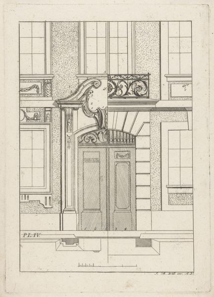 Editor: We're looking at "Paviljoen van Fama," or "Pavilion of Fame," an engraving by Louis de Châtillon dating from 1672 to 1686. It's quite austere, all straight lines and classical motifs. What stands out to you about its composition? Curator: The artist has orchestrated a rigid architectural symmetry, effectively dividing the image along a vertical axis. The Doric columns rhythmically punctuate the façade. The proportional relationships between the base, shaft, and capital of the columns speak to a specific system of classical aesthetics. Note the meticulous detail in rendering the entablature. Editor: Yes, the details are striking! The friezes above the doors and windows add another layer of detail. How do these decorative elements impact your reading of the work? Curator: These embellishments disrupt, yet reinforce, the underlying geometry. Consider how the curvilinear forms contrast with the rectilinear structure. We see a tension between ornamentation and structure. Moreover, it evokes, through semiotic coding, ideas of status and permanence through these iconographic figures and architectural referents. It invites the viewer to contemplate the essence of ‘Fame.’ Editor: It's interesting how the rigid structure highlights those subtle variations and decorations. I was initially focused on the overall form but now I notice the deliberate use of embellishment. Curator: Indeed. It speaks to the complexities inherent within formal structure; surface detail often reflects a deeper intellectual investigation. Consider the philosophical implications present when analyzing the structural elements and iconographic forms in isolation, together suggesting ideas of legacy and societal standing. Editor: Thank you. Looking at it now, I appreciate the level of detail within the rigorous structure, which provides the possibility for such nuanced contemplation.
