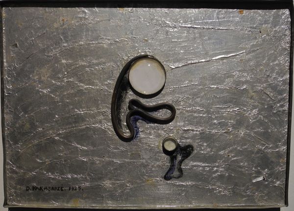 Editor: Kakabadze's "Constructive-Decorative Composition" from 1924. The combination of collage and mixed media gives it such a compelling, almost otherworldly quality. It is intriguing but quite unusual and thought-provoking, what do you make of it? Curator: Oh, Kakabadze. Always bending reality! The silver background – crumpled, almost lunar – it's not just a backdrop, it's the future as envisioned in the roaring twenties, don't you think? This idea of the modern, everything shiny and new, juxtaposed against these repurposed optical lenses... it speaks volumes about perspective, doesn't it? Editor: Perspective in what way? The use of the lenses seems deliberate. Curator: Exactly! Are they distorting reality, enhancing it, or perhaps suggesting a fragmented view? The Constructivists were all about breaking down forms, rebuilding the world in geometric harmony. And, well, Kakabadze does use geometric abstraction; But he doesn't just stick to that. It's almost playful. As if to say: "Here’s the future... but let's peek at it through a slightly cracked lens.” See the whimsy? Editor: I think I get what you're saying! The playful cracked lens adds an unexpected level of vulnerability. It makes the piece more engaging! Curator: It humanizes it! Kakabadze pulls you in to think it over; What's more human than our messy, subjective way of seeing things? It's art inviting us to ponder. Editor: This has completely shifted my perspective! I was stuck on its unusual elements, but now, I feel it. Curator: Good! It is truly delightful when we grasp that, beneath abstraction, art often whispers the most human of stories.